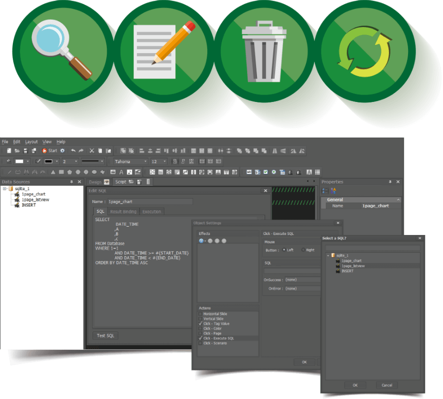 X-SCADAでは、簡単なアクション機能だけでデータベースを制御できます。
